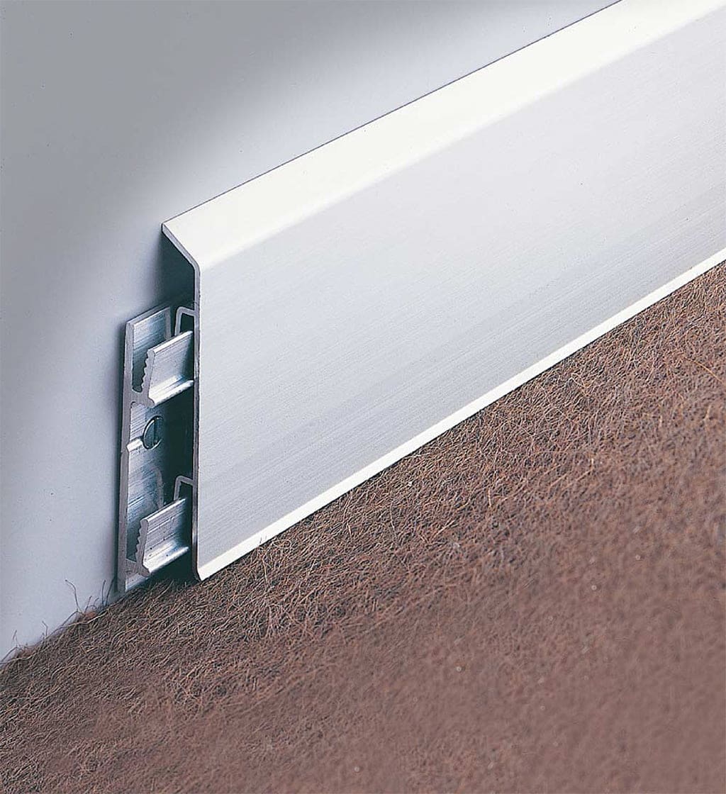 Durable aluminium skirting BI profiles are composed of two interlocking elements: a track, anchored with flathead screws, which channels low voltage cabling such as telephone, TV and computer wiring; an interlocking finishing profile conceals and protects the cabling yet allows fast and easy access. The skirting is ideally suitable for offices and shopping centers where cabling is required and elegant detailing is essential.