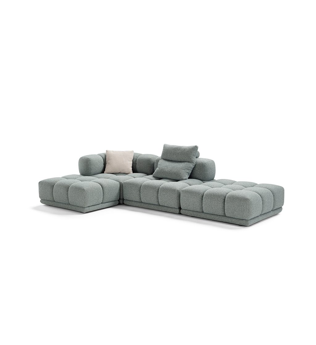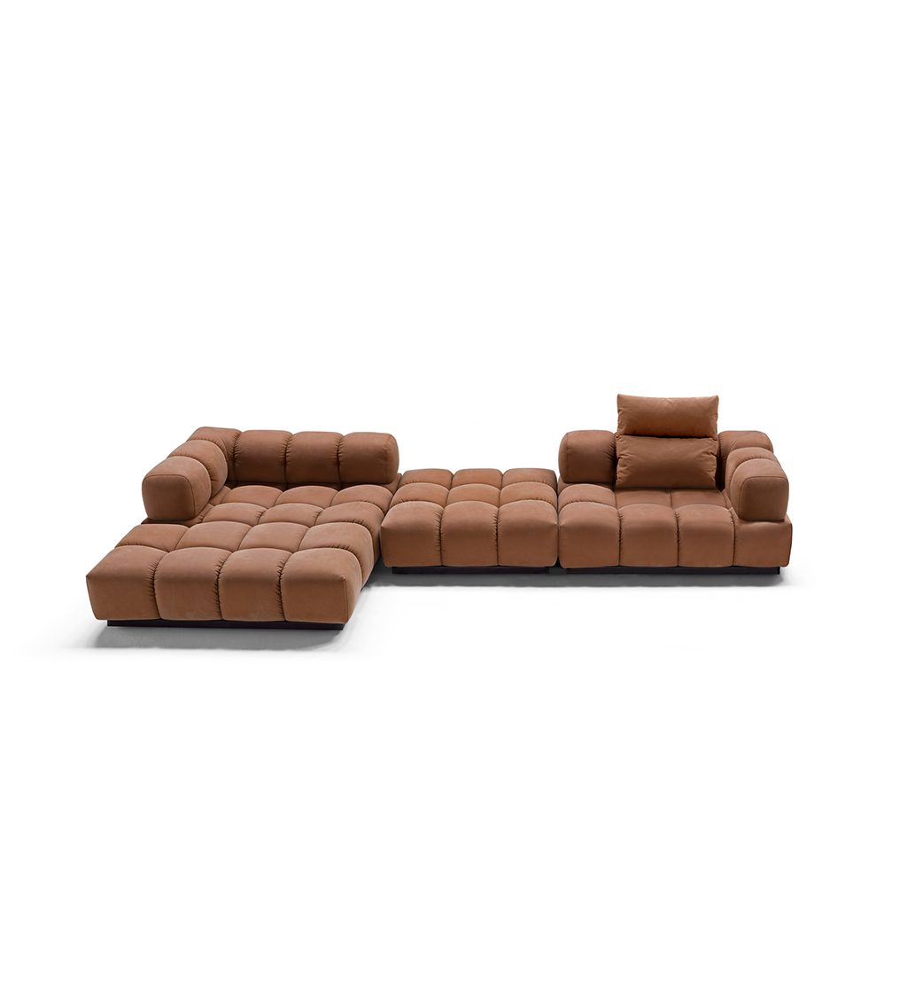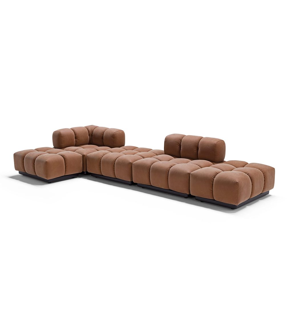 Designul explorează efectul de matlasare realizat cu măiestrie, dispus într-o succesiune ritmică regulată, care definește estetica flexibilă, dinamică și plină de vitalitate a canapelei. Un element puternic care evidențiază modularitatea tip șah a modelului Sacai, în toate multiplele sale configurații.