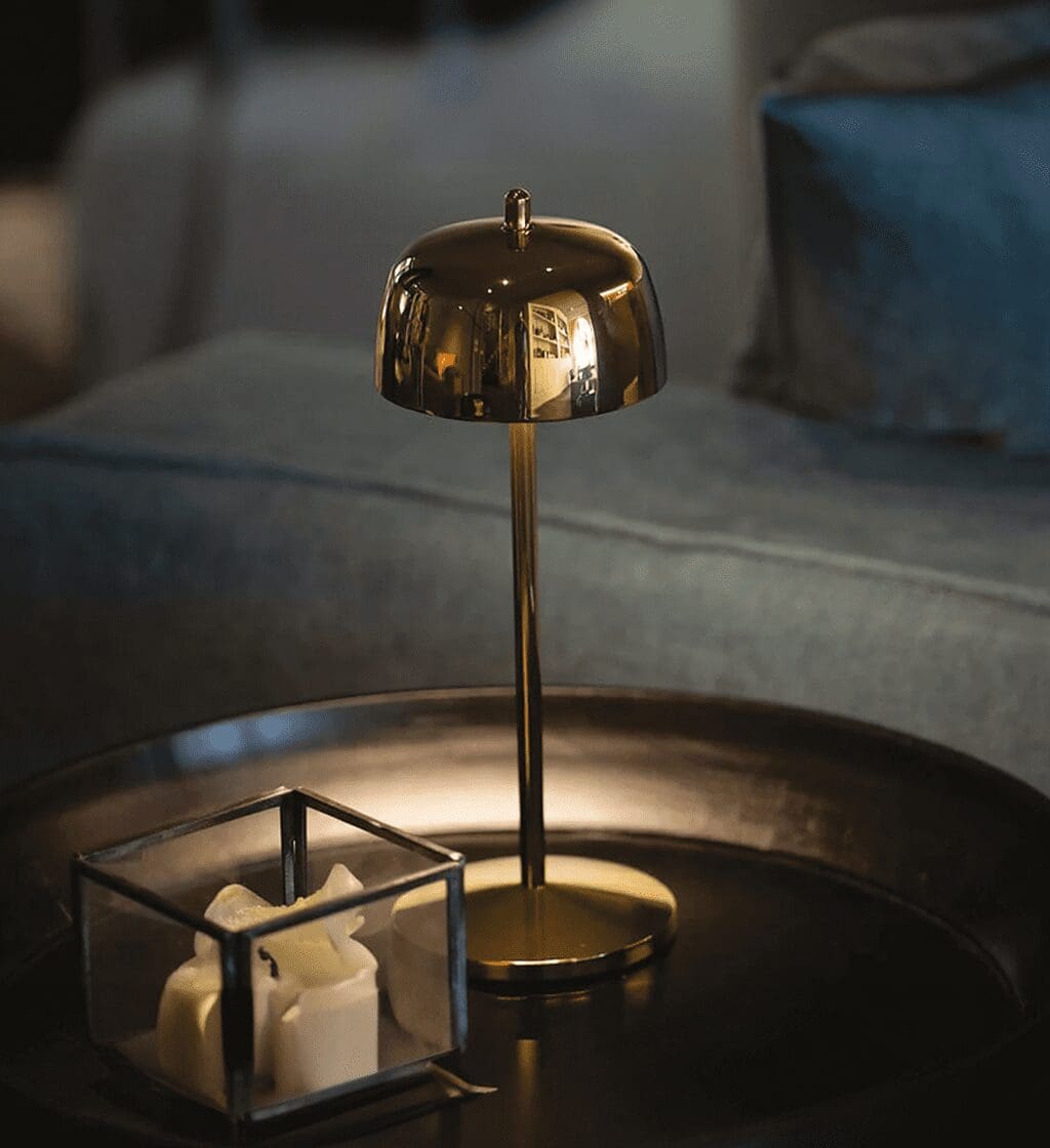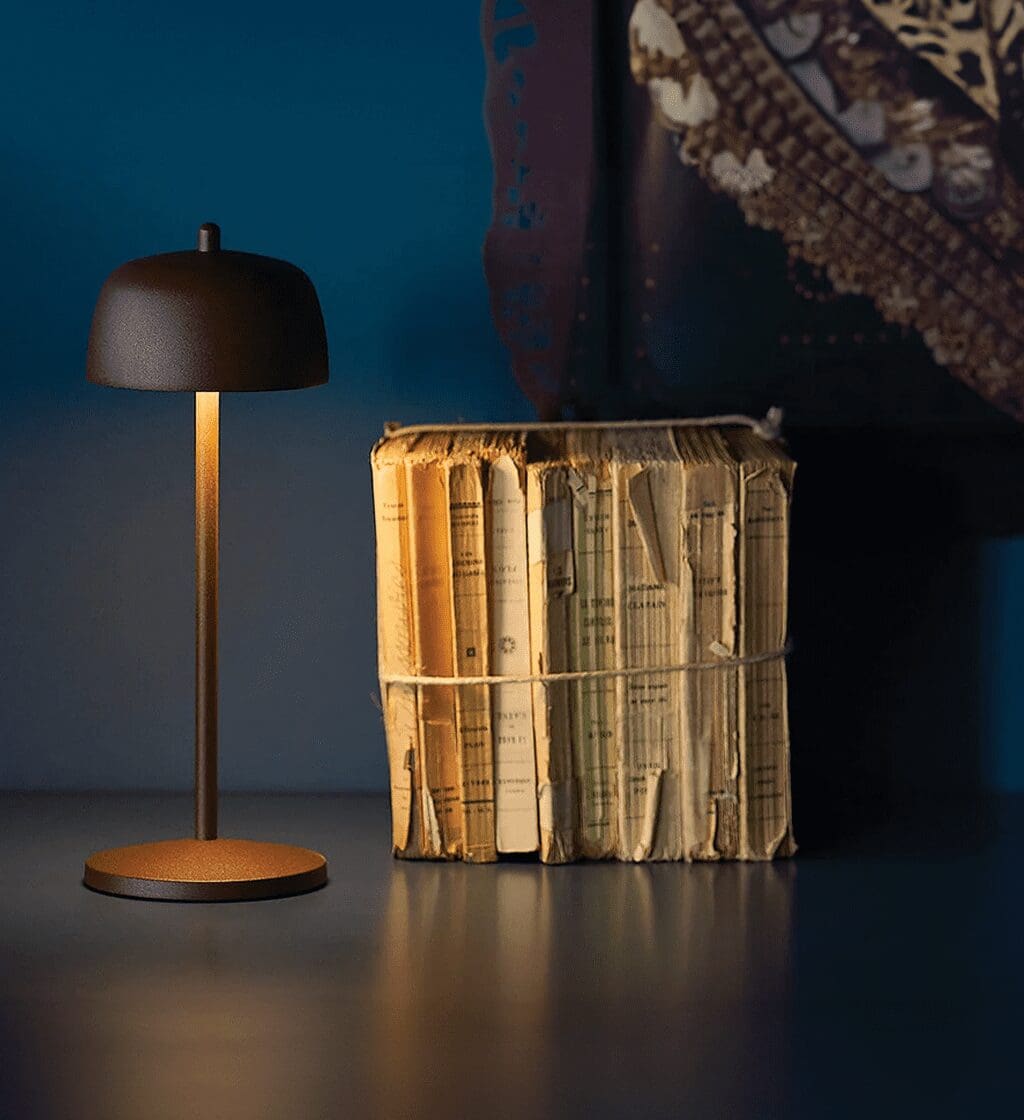 Circe is a rechargeable battery-powered cordless table lamp. The knob on the top of the lampshade allows switching on/off, dimming, and tuning the color temperature of the light (Tunable CCT). It is suitable for both indoor and outdoor use (except galvanic finishes). Circe comes with a contact charging base; the battery charger is not included.