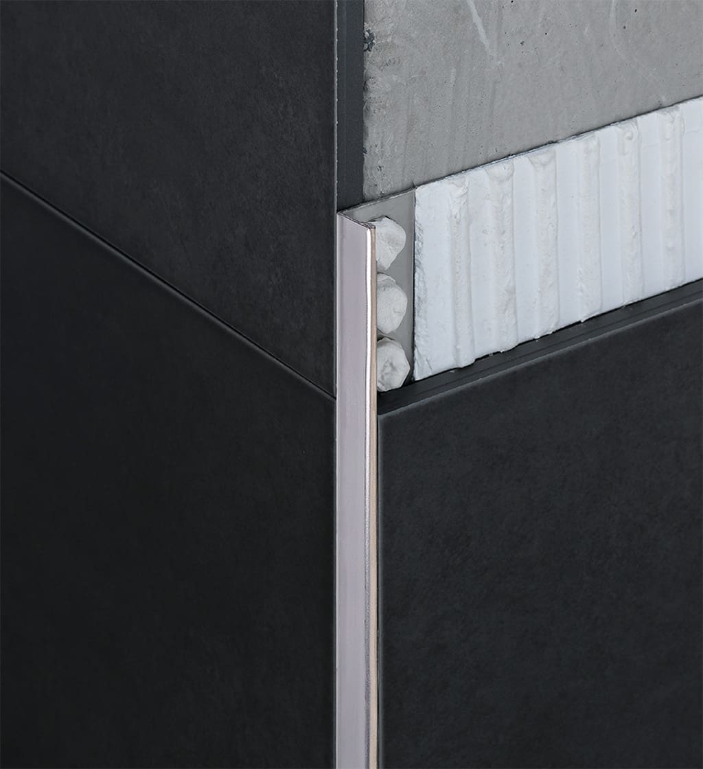Profile with simple lines made of stainless steel AISI 304 alloy. This profile has been designed to be installed as an edge protector, flooring separator, countertop finish. It can be installed with floor or wall tiles between 8 and 15 mm width. Available in high brightness finish. Available finishes: Stainless Steel.