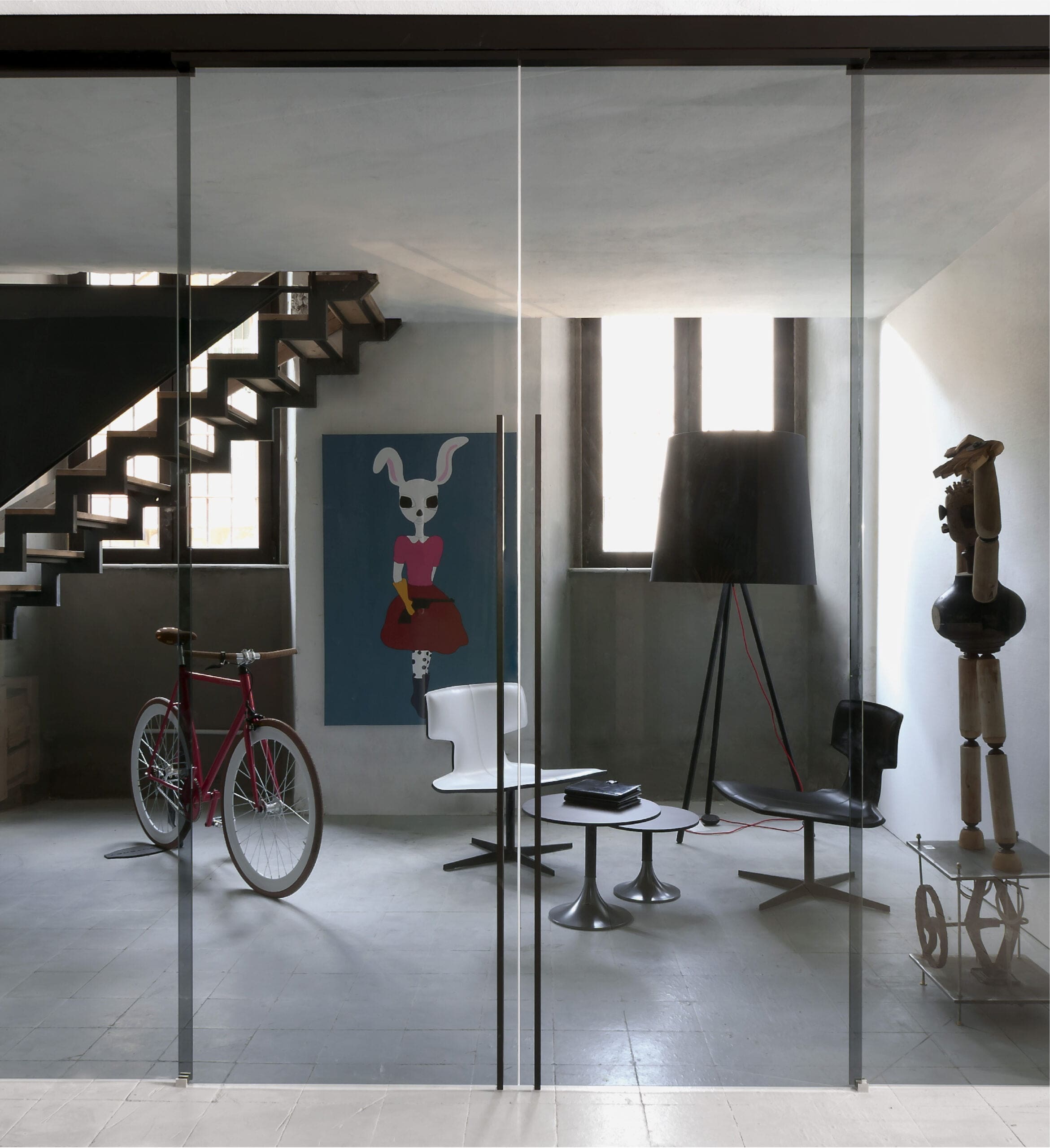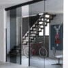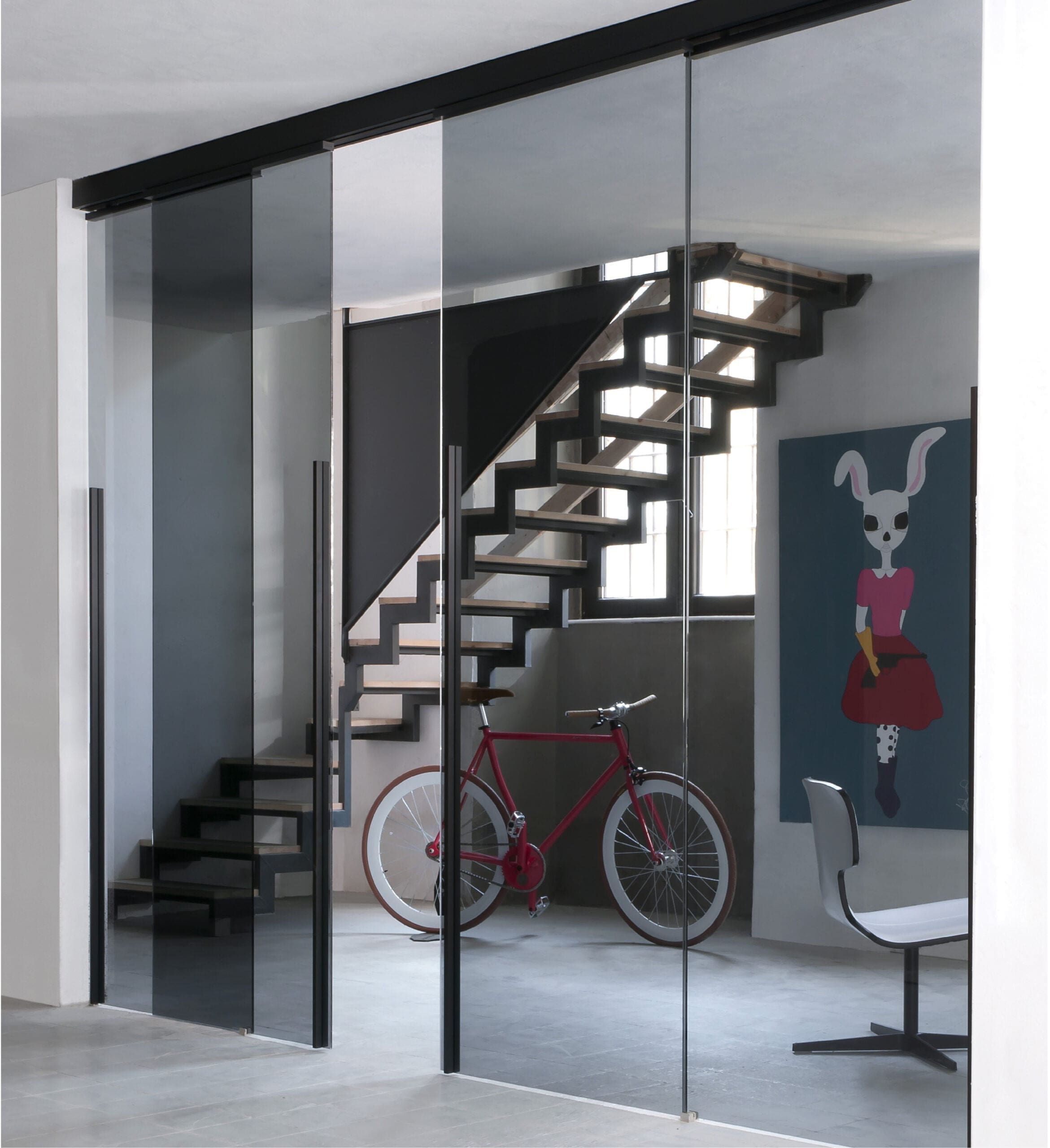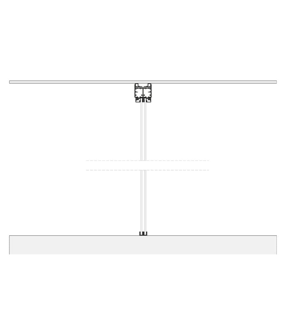 The Dot system highlights the use of a glass panel without any frame. This solution is ideal for creating spaces divided up by sliding panels made of glass only. A light structure in which the structural elements form discreet graphic markings, highlighting the transparency and reflections of the glass.