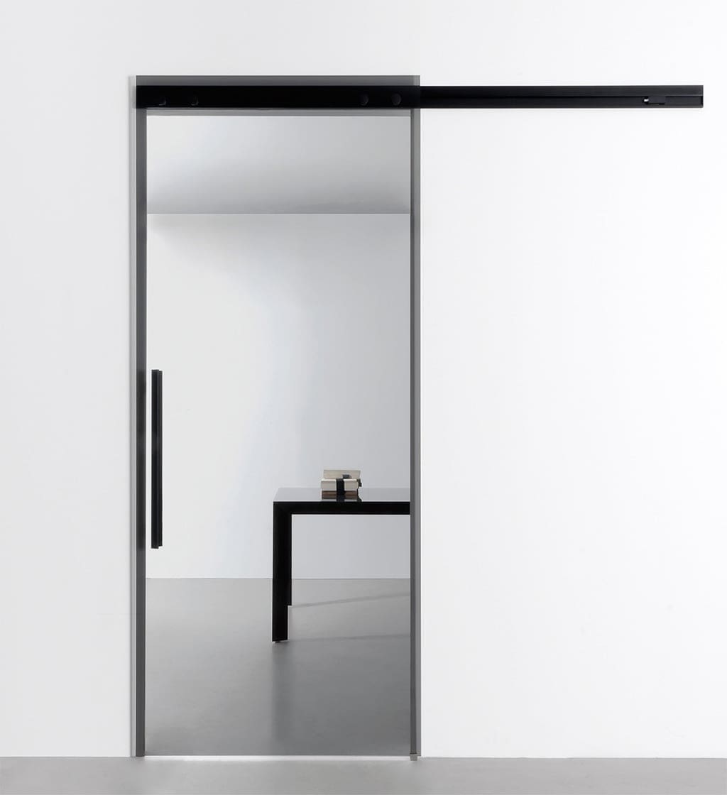 Sail este un model de ușă glisantă din sticlă, cu șina montată pe perete. Tocul din aluminiu negru sau gri îi oferă o alură ușor industrială.