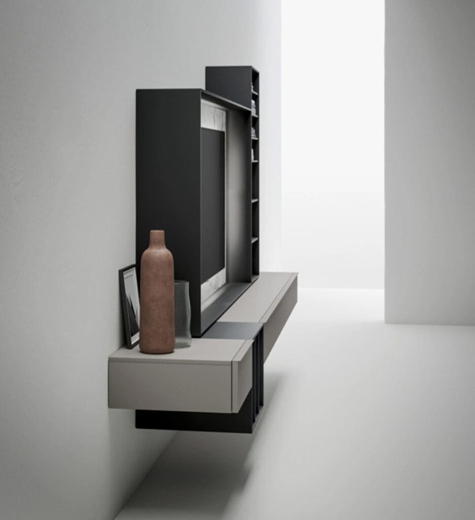 Un nou concept pentru ansamblul de mobilier TV: comoda suspendată subțire pare că plutește, iar corpurile de depozitare creează jocuri de volume. Formele geometrice dau viață peretelui, creând un loc special pentru televizor, reviste, cărți și dispozitive media.