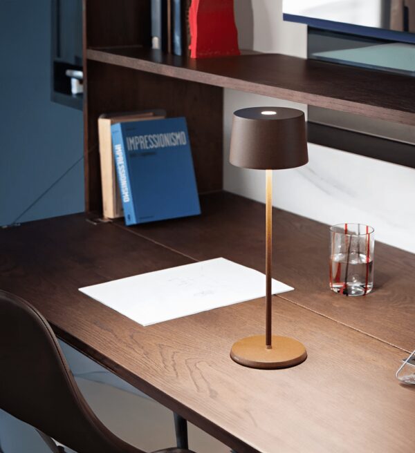 Olivia este o veioză portabilă modernă, potrivită acasă sau la restaurante, atât pentru interior, cât și pentru exterior (cu excepția finisajelor auriu, argintiu și cupru). Lampa vine cu o bază de încărcare prin contact.
