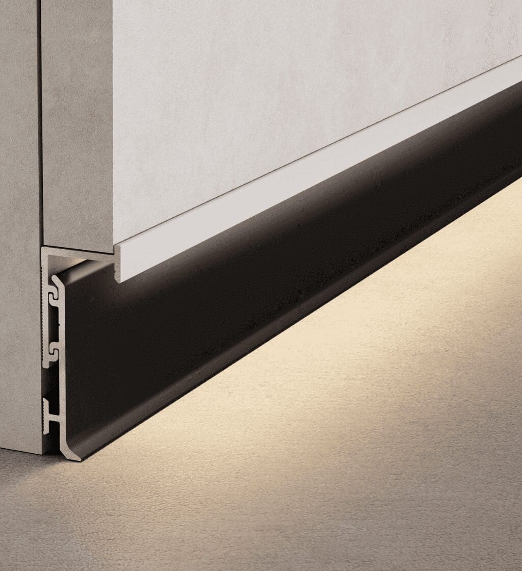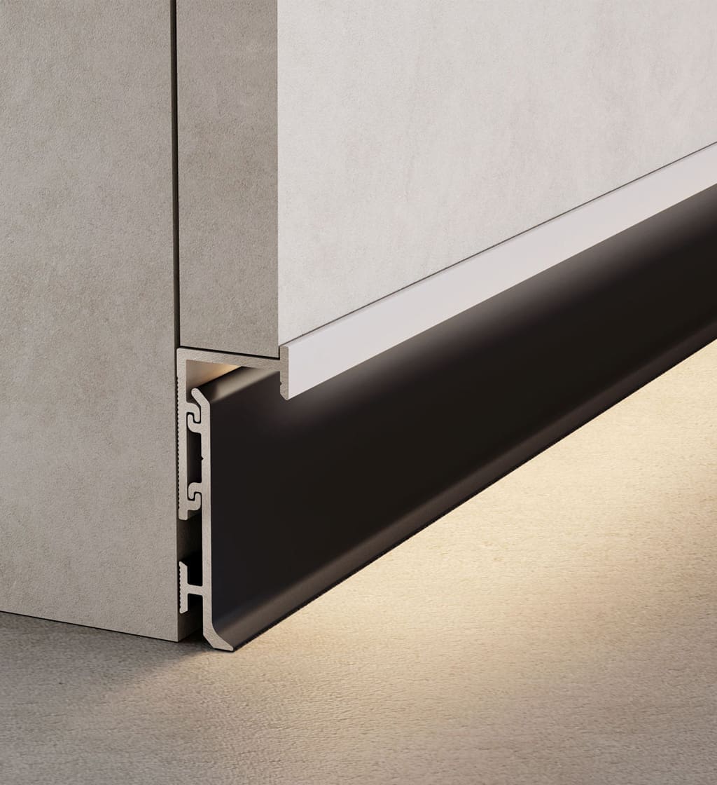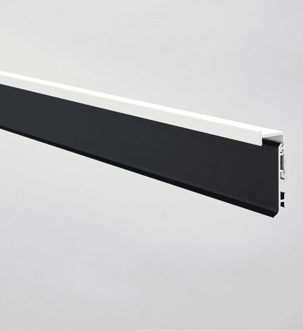 Profil Plinta Shadow Gap Novorodapie Eclipse Aluminiu Negru mat anod, 2m, NRECSHAL13NM este o plintă minimalistă, de dimensiuni reduse, fabricată din aluminiu, care creează efectul de perete suspendat. Profilul său alb de bază permite integrarea completă în pereți, mărindu-i vizual și sporind efectul de lumină-întuneric în combinație cu finisajele la modă ale profilului ornamental: argintiu mat, negru mat și auriu periat elegant.
