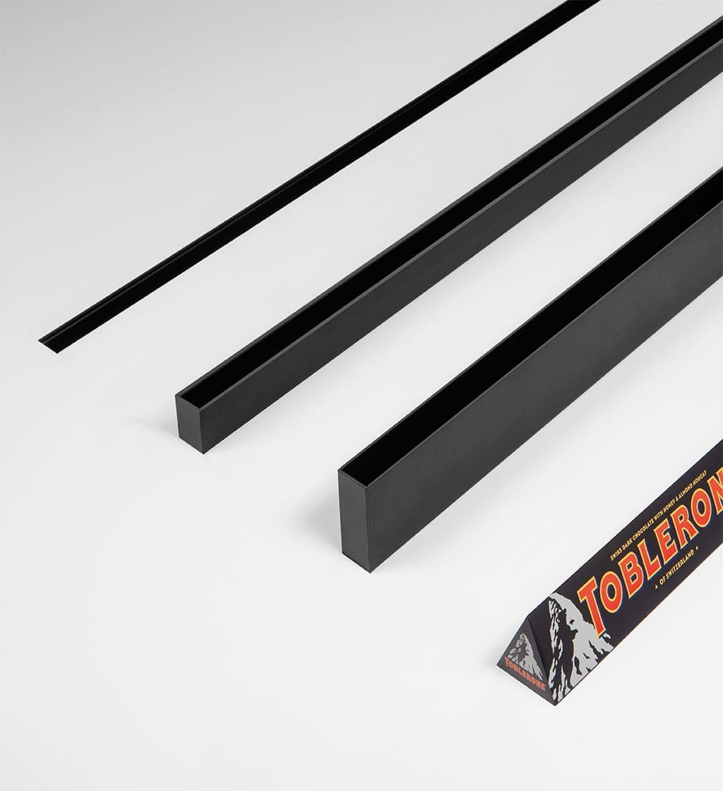 Versiunea trimless apare ca o linie minimalistă îngustă, în timp ce variantele aplicate și suspendate oferă un aspect sobru și discret.